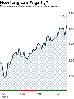 Not that you'd know the difference to look at the market. The annual cost of insuring $10 million of Greek debt soared past $1.4 million this week, and the yield on 10-year Greek bonds hit an eye-watering 15%. Credit spreads hit new highs in Ireland and Portugal too. Investor flight from Greece, Ireland and Portugal has the makings of an existential problem for the euro zone. The European Union has spent the past year bailing out weak states and their too-big-to-succeed banks, without addressing the productivity problems that laid the weaker states low in the first place. Yet the euro, thanks to the inflation-squashing vigor of the European Central Bank, is now trading within 10% of the all-time high it hit against the dollar in 2008, just before the global economy came apart at the seams. The higher the euro goes, the more stress on laboring European economies. How long can this go on? In an ugly new twist on Keynes' aphorism, it is starting to look like the market can stay irrational longer than Europe's weaker states – or their banks -- can stay solvent. When investors finally catch on, the fall could be brutal. "We're peering over the precipice right now," says Scott Minerd, chief investment officer at Guggenheim Partners. He is betting the euro will fall from a recent $1.46 (see chart, right) toward parity with the dollar or even beyond, as investors finally divine the extent of Europe's problems: "There is just no way out when you start to add up all the numbers." The unhappy math starts with the banks. In a replay of the subprime crisis here, the banks in Europe are politically powerful -- but financially weak, largely opaque and highly exposed to the worst case scenario, in this case a sovereign default. The three weak European states account for just 5% of annual European Union economic output. But EU banks hold $147 billion of Greek sovereign bonds and $115 billion of Irish and Portuguese debt – including $108 billion of bonds held by EU banks outside those countries. And if anything, keeping the banks healthy over there is more important to growth than it is here. Banks are responsible for 74% of credit extension in the euro area, the Organization for Economic Cooperation and Development estimates. That compares with just 24% in the land of Fannie Mae mortgages. "The problems start with weak capitalization and a lot of interconnectedness, which means problems in one place can easily become systemic," says Daniel Gros, director of the Center for European Policy Studies in Brussels. "But it's hard to put a number on exactly how bad it is." Confidence in the banks hasn't been helped by regulators' failure to include a sovereign default in the stress tests they are running again this spring. Fears about what the banks really look like could kindle a flare-up of the sovereign debt crisis into a regional headache into a Continent-wide contagion. So far, the ECB and European politicians have done just enough to keep the pot simmering without rolling into full boil. But the weak states remain vulnerable to a loss of confidence by depositors. It is an international bank run that pushed Ireland into its unpopular bailout last fall. Deposits held at Irish banks by nonresidents plunged 49% from a year ago through February, Minerd estimates. So far, there is no evidence of a run on Portuguese banks. But Gros worries what might happen if funds start fleeing from Greece -- let alone Spain, which is much bigger than any of the bailout three. Its banks could face rising losses as the ECB raises rates, punishing an economy already laboring, if you will, under 20% unemployment. "I don't really see a solution in Greece or Ireland or Portugal that doesn't involve haircutting the debt," Minerd says. As that plays out, he adds, "We are looking at a massive credit crunch in Europe over the next 18 to 24 months." The dollar, believe it or not, also rises. |