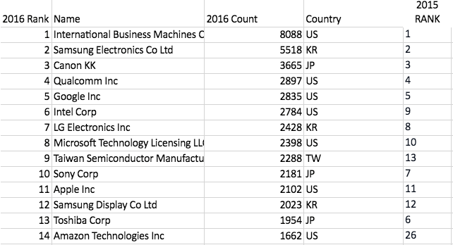 IBM software engineer Jeremy Greenberg sketches out a patent he has pending at the company's headquarter's in Research Triangle Park, N.C. IBM earned a record 8,088 U.S. patents in 2016 thanks in part to the company's research into artificial intelligence and predictive analytics. Meanwhile, other American U.S. tech companies, including Qualcomm and Google were among the other leaders in earning patents, which many see as a metric of innovation. The figures, published by researcher IFI Claims Patent Services, also show Amazon (amzn) posting a 46% increase in patenting activity as the Seattle company claimed 1,662 inventions last year. From a country perspective, U.S. firms led with 41% of all patents received, followed by Japan (28%) and South Korea (15%). Here is a screenshot from the IFI report, which listed Apple as No. 11 for the second year in a row: |