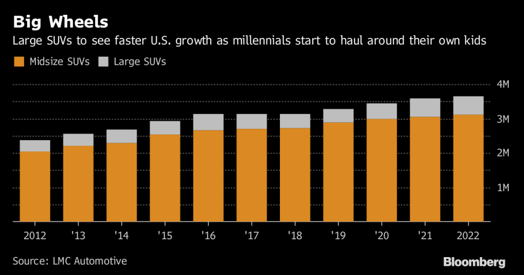 The shift to suburbia may surprise those who’ve chided millennials for being more interested in pricey avocado toast than in saving for a home. Much of the generation delayed marriage, childbearing and home ownership after graduating with heaping student-loan debt and entering a weak job market. As more millennials overcome this, many want the life of their baby-boomer parents -- the kids, the house in the ’burbs and the beefy SUV. “As more people move out of their parents’ basement -- and there’s still quite a few living there -- we expect to see continued healthy demand for homes,” said Svenja Gudell, chief economist for Zillow, which found millennials made up 42 percent of homebuyers last year. “Millennials delayed home ownership, just like they delayed getting married and having kids, but now they’re making very similar decisions to their parents.” Strollers, Cribs More millennials are expected to move up into bigger SUVs with three rows of seats and enough cargo space for strollers and portable cribs. Sales of midsize SUVs will grow by 16 percent between now and 2022, while deliveries of the biggest rigs -- think Ford Expeditions and Chevrolet Tahoes -- will jump 25 percent, according to a forecast by researcher LMC Automotive. Millennials ranked having children, buying a suburban home and driving a big family vehicle higher in terms of importance than living in a major city or relying on alternate forms of transportation in a survey that Ford conducted in June. “There’s no question people are waiting longer, but people still want to have children,” Erich Merkle, Ford’s U.S. sales analyst, said in an interview. “As long as people have children and those children grow and acquire friendships, it requires more space.” Today, the largest group of midsize and large SUV buyers is between the ages of 35 and 44, Merkle said. That cohort, known as Gen X, is significantly smaller than millennials, who are about 80 million strong. More Buyers “There’s going to be an extra 25 million people passing into and through the 35- to 44-year-old demographic over the next 10 to 15 years,” Merkle said. “That’s going to lead to a gradual increase in the growth of large and midsize SUVs that’s already starting to happen.” Merkle wouldn’t say if Ford expected sales of larger SUVs to eventually outpace compact utilities, a segment that’s surged past family sedans like the Toyota Camry and Honda Accord. Ford forecasts that SUVs will grow to 45 percent of the U.S. market in the next five to seven years, from 40 percent now. Increasingly, that growth will be driven by millennials, the oldest of whom have lifted the annual birthrate for women 30 to 34 to the highest level since 1964, according to the U.S. Centers for Disease Control and Prevention. “As a sample size of one, I certainly need a lot of space because it’s really tough to travel with a child,” said Zillow’s Gudell, who drives an Audi Q5 SUV. |
