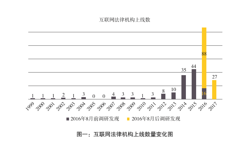 自2014年开始,互联网法律机构上线进入上升阶段,至2016年达到高峰(该年上线数104),2017年互联网法律机构上线数量有明显回落,跑马圈地各占山头的高峰已经过去。