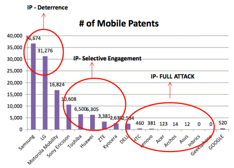There's some pretty blunt language in the latest note to clients from Global Equities' Trip Chowdry, who may have been spending too much time talking to retailers and developers. He estimates that Motorola Mobility (MMI) has sold somewhere between 25,000 and 120,000 Xoom tablets -- hardly a propitious start for a company he perceives as being on the ropes. The successful launch of the iPhone on Verizon (VZ), he writes, has "taken the wind" out of Android's sails. The Google (GOOG) app store is "a disaster." Honeycomb, the operating system on which Motorola has hitched its wagon, is "incomplete," "unstable," has a "poor UI" and is basically "dead on arrival." All in all, Motorola's "competitive fixation" on Apple (AAPL) and Research in Motion (RIMM) is misplaced. Rather than trying to innovate on software, Chowdry suggests, "selectively attacking with patents other Android phone OEM's is a better strategy." In support of that depressing proposition, he posts the chart above, showing who has patent protection and who is ripe for "full attack." |