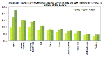 A report issued Wednesday by IHS iSuppli confirmed what most experts already assumed was true: Apple (AAPL) has overtaken Hewlett-Packard (HPQ) and Samsung to become the world's largest consumer of semiconductors among so-called original equipment manufacturers (OEMs). According to analyst Wenlie Ye, Apple's appetite for memory chips grew 79.6% in 2010 and is still growing. iSuppli's explanation for how this came to be reads like a page out of Steve Jobs' playbook: (I quote) Although Apple and Hewlett-Packard have been rivals in the computer space for many years, an examination of their respective semiconductor expenditures shows that the two companies are fundamentally different. Apple is more a wireless devices maker than a computer maker. The company spent approximately 61 percent of its semiconductor budget in 2010 on wireless products such as iPhones and iPads. In contrast, 82 percent of Hewlett-Packard's 2010 semiconductor spending was dedicated to computer products like desktops, notebooks and servers. This worked to Apple's benefit, with the smart phone and tablet markets massively outgrowing the computer segment in 2010. Smart phone shipments in 2010 rose 62 percent, while tablets exploded by more than 900 percent, driven by the introduction of Apple's iPad. In contrast, global PC shipments grew a relatively weak 14.2 percent in 2010. Apple strength in hardware sales lies in its device and media ecosystem—every Apple product is connected through iTunes/iOS and is synergetic with all other Apple products. As a result, committed users of the Apple ecosystem derive more value from each additional Apple device they buy, and users have little interest in leaving the Apple realm. In other words, through a common ecosystem, Apple leverages each device to sell other devices. Rising device sales to consumers then leads to increased semiconductor purchasing by Apple. In comparison, the traditional PC business does not put heavy emphasis on the creation of an ecosystem. A buyer that once purchased a Hewlett-Packard PC would just as likely purchase a Dell PC next if the price was better, given that there is little or no value in purchasing another Hewlett-Packard. |