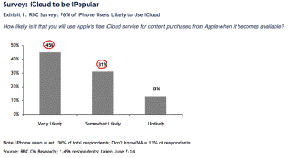 Apple (AAPL) is not a company known for giving things away for free, but when they do, people tend to respond positively. According to a survey conducted for RBC Capital the week after Steve Jobs' iCloud keynote: • 76% of respondents said they were likely to sign up for iCloud, Apple's free e-mail, back-up and data syncing service • 73% said they were likely to use iMessage, Apple's answer to the BlackBerry's messaging service • Only 30% were likely to sign up for Apple's iTunes Match service, which costs $24.99 per year According to RBC's Mike Abramsky, the response to iCloud among the nearly 1,500 people surveyed translates to 150 million subscribers. That would catapult Apple in the big leagues with such online service providers as Facebook (700 million), Microsoft/Skype (700 million), Twitter (300 million), Yahoo (300 million), and Google/Gmail (200 million). "Because it stores user data," Abramsky concludes, "iCloud, along with iTunes, is expected to enhance loyalty and stickiness of Apple's customers, helping defend against threats from Android, helping grow a defensible install base of users who continually upgrade to next generation Macs, iPhones, iPads, and iPods." |