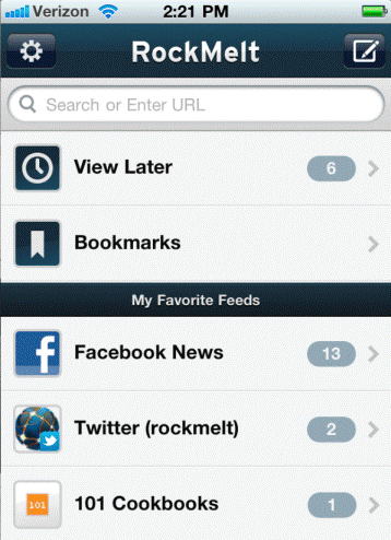• RockMelt, that social media-focused web browser that launched last year, announced RockMelt mobile, a standalone free app that takes a slightly different approach to the browsing experience. The home screen (see below) still lets users search and input web URLs but puts their RSS and social feeds front and center. There's also a new "View Later" feature -- select a particular story on the mobile version, for instance (eg. Today in Tech) and it'll sync up with and load up in the RockMelt desktop browser for easier reading. Expect it to hit the App Store within the next few days.