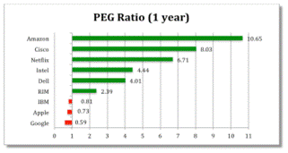 大力倡导PEG比率的彼得•林奇认为,任何公司的市盈率如果合理,都会等于其盈利增长率。换言之,一只股票的PEG比率若低于1,该股可能被低估。反之,如果你购入的股票PEG高于1,你可能多付了钱。 那么,苹果(Apple)的PEG比率如何呢?根据纳斯达克网站,其PEG比率为0.73,显著低于1.0。该网站采用的是金融分析师们对未来12个月每股收益和盈利增长率预估的平均值。唯一一只PEG比率更低的大型科技股是谷歌(Google),为0.59。在估值区间的另一头是亚马逊(Amazon)、思科系统(Cisco)和Netflix,12个月PEG比率分别为10.65、8.03和6.71。 好好想想吧! According to Peter Lynch, who popularized the measure, the P/E ratio of any company that's fairly priced will equal its growth rate. In other words, a stock with a PEG ratio less than one is probably undervalued. Conversely, if you're paying more than a PEG of 1.0 for a stock, you're probably paying too much. So what's Apple's (AAPL) PEG Ratio? According to NASDAQ's website, which uses the 12-month forecast earnings and growth rates of a consensus of financial analysts, it's 0.73, considerably less than 1.0. The only major tech stock with a lower PEG ratio is Google (GOOG) at 0.59. On the other end of the spectrum are Amazon (AMZN), Cisco (CSCO) and Netflix (NFLX) with 12-month PEG ratios of 10.65, 8.03 and 6.71, respectively. Go figure. 相关稿件